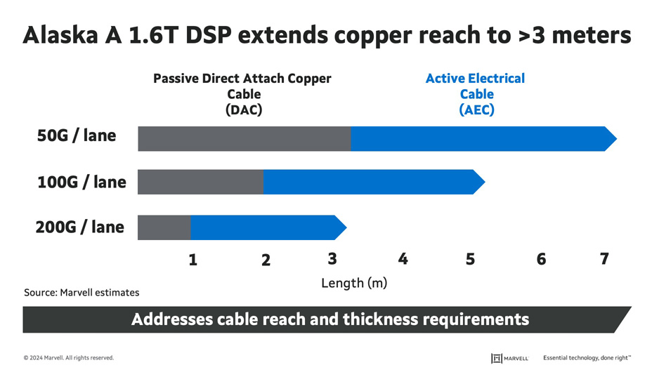 Active Electrical Cables (AEC) effectively add an optical DSP to the terminal end of copper cables to amplify and fine-tune signals. For instance, the Marvell® Alaska® A 1.6T PAM4 DSP for AECs, introduced earlier this year, is the industry’s first 1.6 Tbps device for this application. While adding semiconductors to the cable increases costs and total power consumption, it extends the distance threefold at 200G and up to seven meters at 50G. At these distances, copper becomes a viable medium for server-to-switch and server-to-server connections as well as for linking systems in AI clusters.